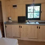 Der Innenraum ist mit einem Sofa möbliert und bietet zudem einen Ausblick auf den Garten. Zur Ausstattung des Badezimmers gehören auch eine getrennte Toilette und eine Dusche.